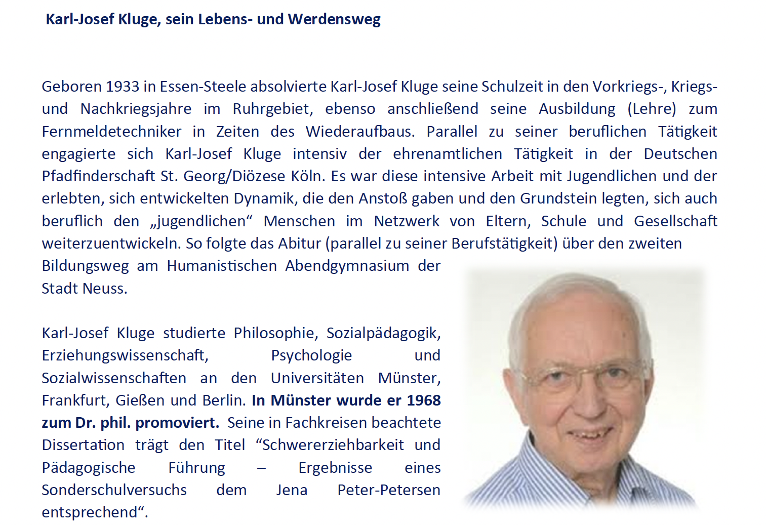 Wir, die Kolleginnen und Kollegen des Forschungs- und Lehrbereiches Erziehungshilfe und sozial-emotionale Entwicklungsförderung sowie des Departments Heilpädagogik und Rehabilitation trauern um unseren Kollegen und Hochschullehrer Karl-Josef Kluge, der sich jahrzehntelang hoch engagiert sowohl für die qualifizierte Ausbildung insbesondere von zukünftigen Lehrkräften im Rahmen des Förderschwerpunktes Emotionale und soziale Entwicklung als auch für die Belange von Kindern und Jugendlichen mit erhöhten psychosozialen Risiken und ihren Eltern einsetzte. Wir werden Herrn Kollegen Karl-Josef Kluge in ehrender Erinnerung behalten. Weitere Informationen zum Werdegang von Herrn Kluge finden Sie hier.